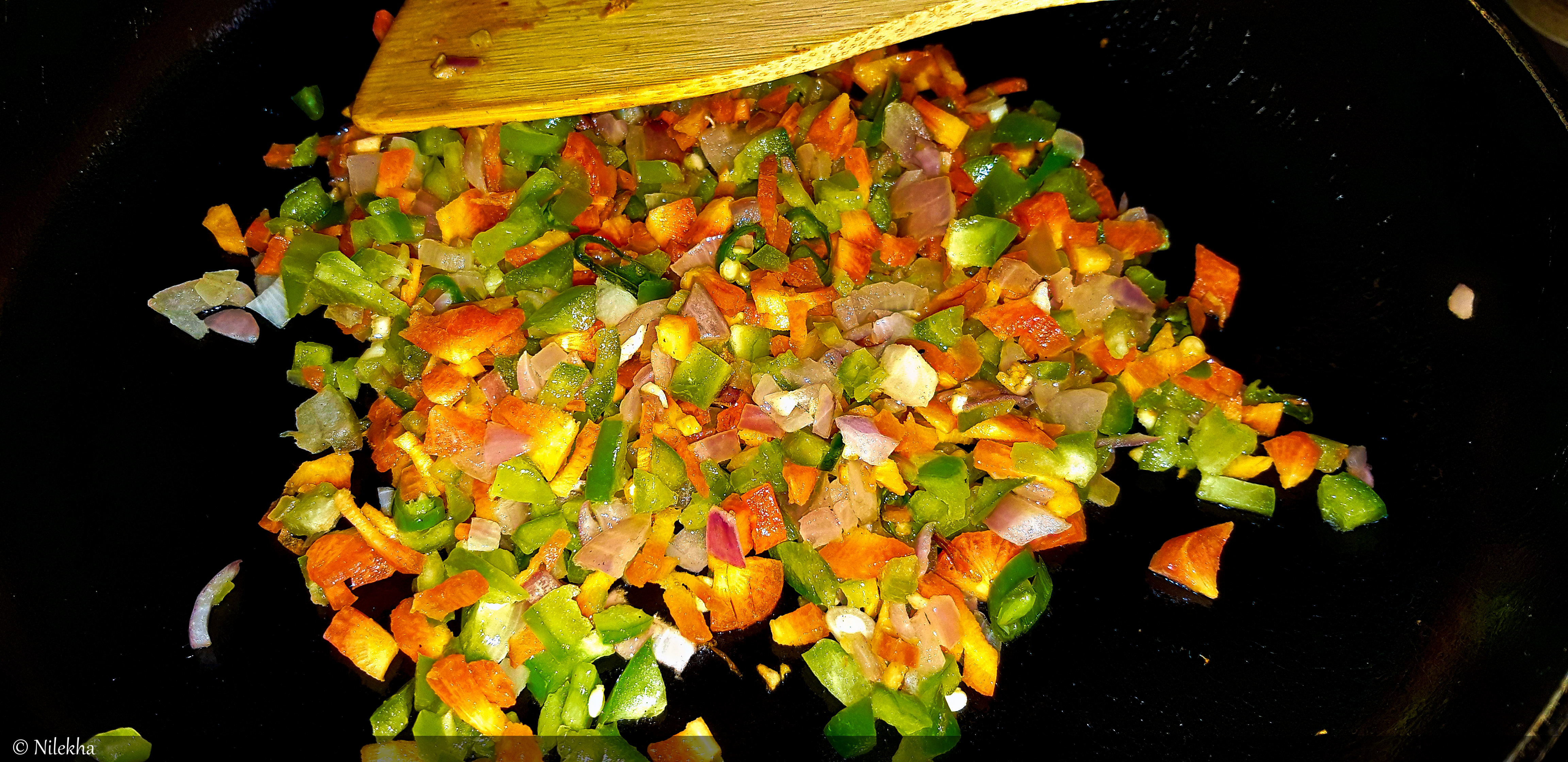 No matter the origin & authenticity, we love Hakka Noodles. Raw Hakka Noodles are made of durum wheat or rice flour. Thanks to many noodle manufacturers, we don’t need to learn how to make noodles from scratch. Buying Hakka Noodles pack should suffice. While making Hakka Noodles, noodles are parboiled or cooked al dente (firm to bite) or up to 70%-80% in salted water. After being parboiled, they are drained, held under running tap water (to stop cooking process), strained & rubbed with little oil. For making veg Hakka Noodles finely chopped garlic, ginger & onions (red/spring or both) are sautéed in oil in wok or kadhai. Sometimes even green chillies are used. Any random vegetables that go well in Chinese cuisine like cabbage, carrots, capsicum, mushrooms etc. are tossed with sautéed ginger-garlic-onions.